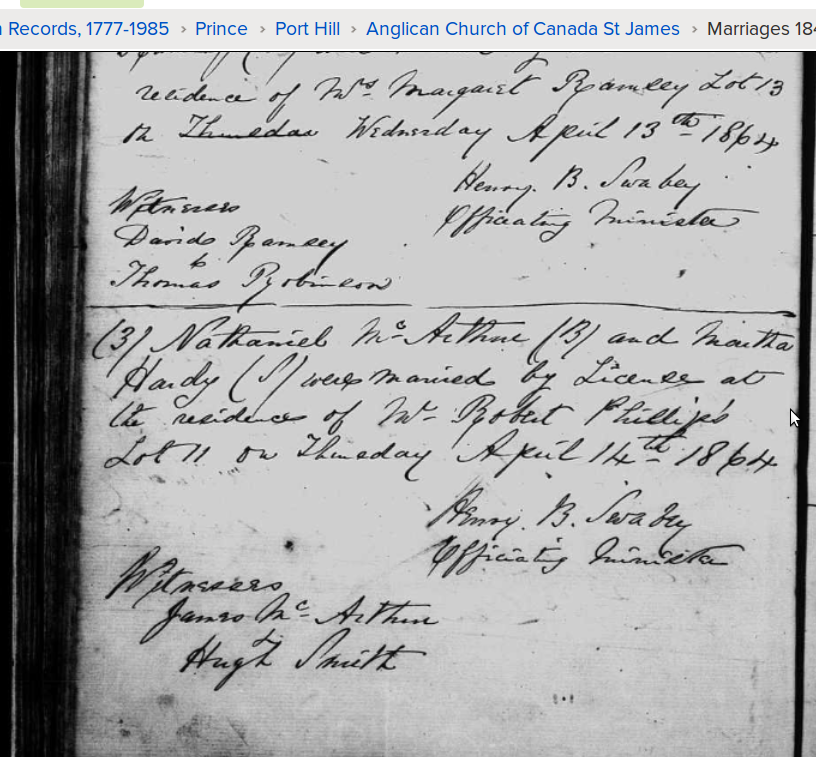 Nathanial married Martha Hardy in the Port Hill Church of England in 1864. Witnesses were James McArthur and James Smith.