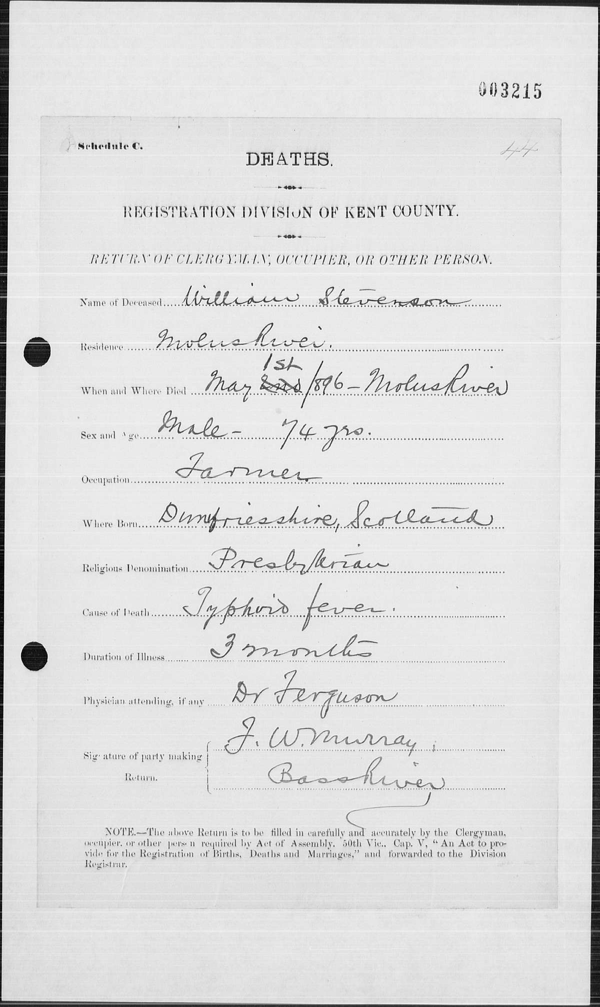 | Death | 1896 | New Brunswick, Canada | NB Provincial Deaths says 1 May 1896 in Molus River, age 74 | |