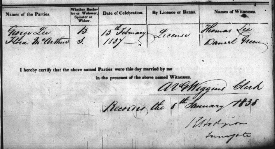 Flora McArthur from Lot 13 married George Lee from Lot 19 in 1837; Thomas Lee was one of the witnesses. Thomas Lee married Mary McArthur, and Thomas Lee was also a witness when Alexander McArthur married Ellen Lee. If Flora's marriage record had said Lot 16, then this family of McArthurs would have been a good fit for her.