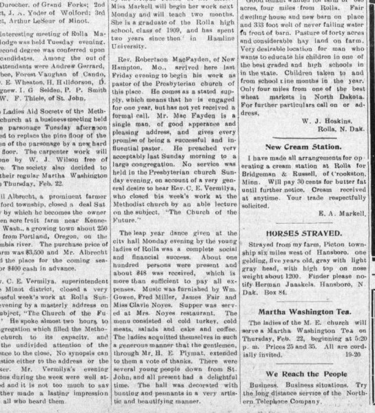 He was described as a single man in a North Dakota newspaper article in 1912: "Rev. Robertson MacFayden, of New Hampton, Mo., arrived here last Friday evening to begin his work as pastor of the Presbyterian church of this place. He comes as a stated supply, which means that he is engaged for one year, but has not yet received a formal call. Mr. MacFayden is a single man, of good appearance and pleasing address, and gives every promise of being a successful and influential pastor. He preached very acceptably last Sunday morning to a large congregation. No service a held in the Presbyterian church Sunday evening, on account of a very general desire to hear Rev. C. E. Vermilya, who closed his week's work at the Methodist church."