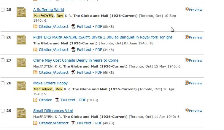 In the 1940s, a series of articles appeared in the Globe & Mail by "Rev. K. R. MacFadyen, B. D." K.R. MacFadyen also wrote letters to the editor, usually on religious/social matters.