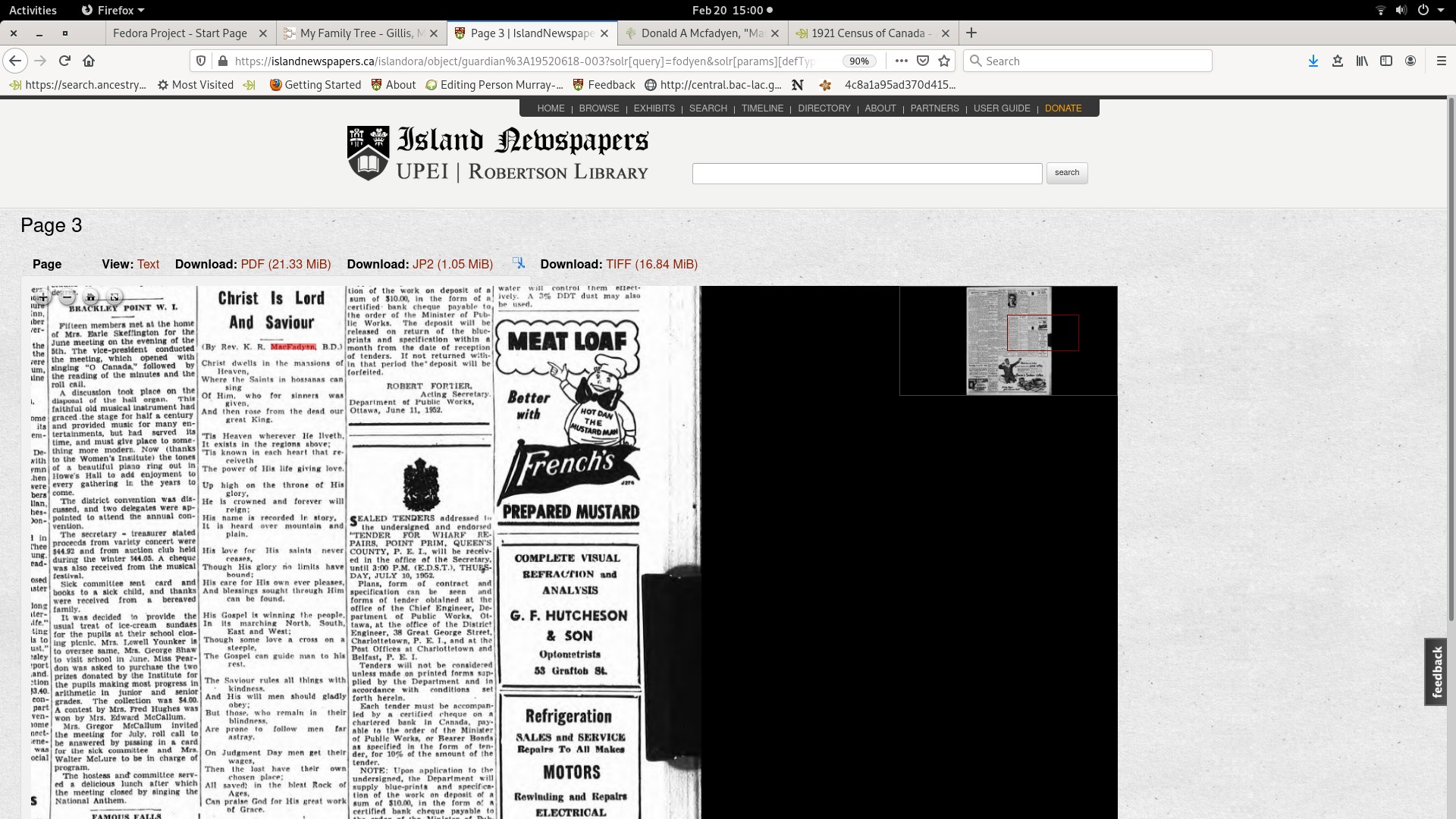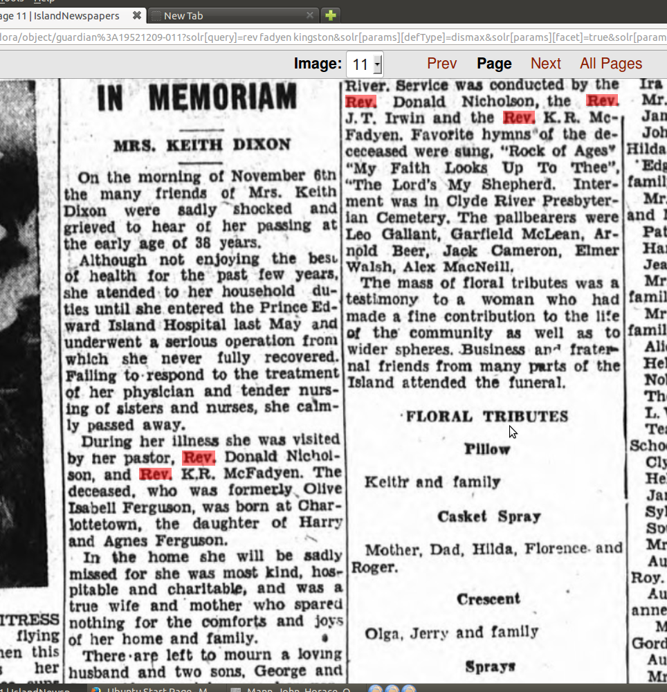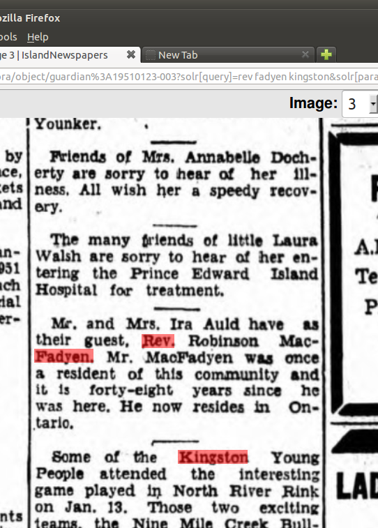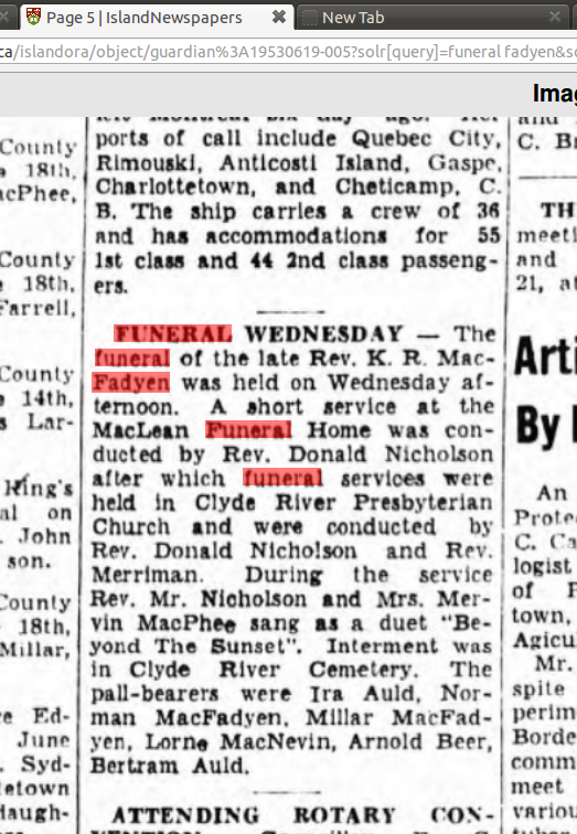"Rev Robertson MacFadyen of United States is enjoying a pleasant vacation at the home of his niece: Mrs. Roscoe Mac Donald. although having been sick at Mrs. MacDonald's for some weeks he is now up and around in his usual good health." Charlottetown Guardian Thursday December 21, 1950