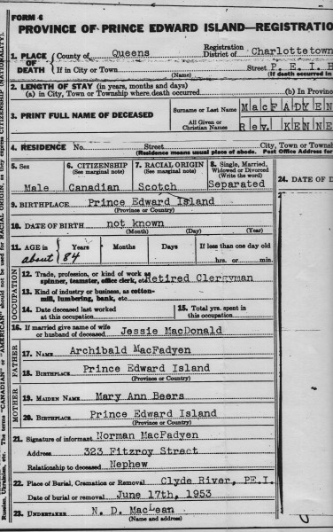 Robertson died in 1953 at the age of 83 in the hospital in Charlottetown. He was buried in Clyde River, but his name is on his parent's gravestone in the Brookfield, Lot 24 Presbyterian cemetery as the Reverend Robertson K. McFadyen. On the death record, his marital status was separated, and only the name of his first wife Jessie was listed.