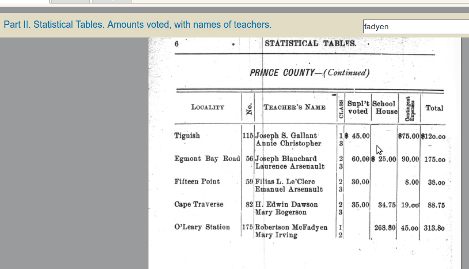 In 1896 Robertson and Jessie Macdonald, daughter of John Macdonald and Margaret Percival of Crapaud, were married in Massachusetts by Rev. A. Ellsworth of the Congregational Church. Jessie's family history can be found in the History of Crapaud. Robertson and Jessie's two children were recorded as being born and baptized in O'Leary, and their birthplace was given as PEI in the 1901 census. Their place of birth was given as Virginia in later US census records. Robertson was the teacher "Robert McFadyen" in O'Leary, mentioned in the book Threads of the Past: "In 1898, the school received first-class rating. The teachers at the time were Robert MacFadyen and Mary Irving." Provincial government reports confirm that it was Robertson in O'Leary at that time.