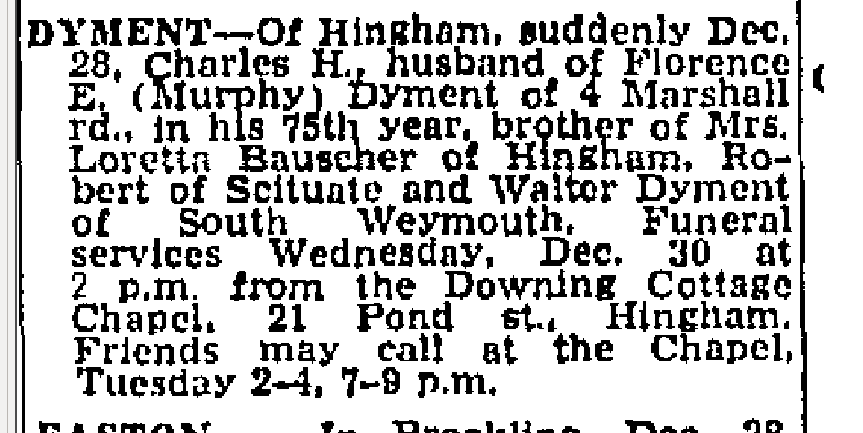 | Death | December 28, 1970 | Hingham, Plymouth County, Massachusetts, United States | death notice in boston globe | |