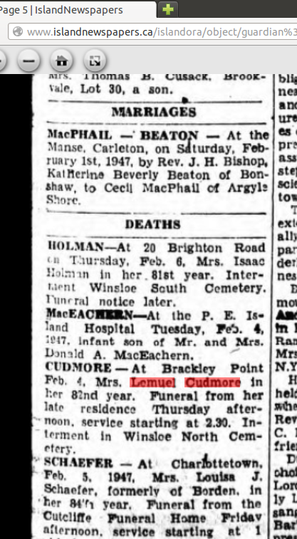 Lemuel died in 1945 in Prince Edward Island. Sarah died two years later. Mrs. Lem Cudmore, Brackley Pt., February 4 1947 at 81 (Master Name Index). Her obituary listed her children, but she had possibly outlived all of her brothers and sisters.