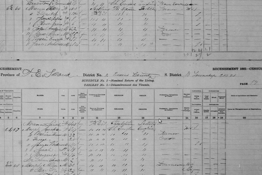 Birth date: abt 1836 Birth place: Prince Edward Island Residence date: 1891 Residence place: Queens, Prince Edward Island, Canada