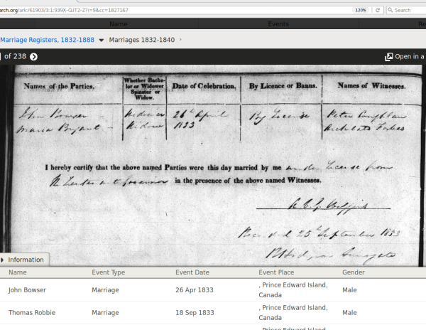 | Marriage | April 26, 1833 | St. Eleanors, Lot 17, Prince County, Prince Edward Island, Canada | ||