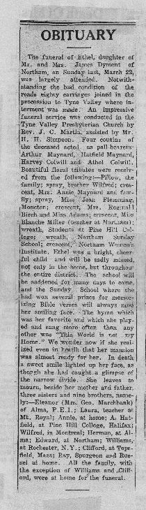 The funeral of Ethel, daughter of Mr. and Mrs. Jas. Dyment of Northam, on Sunday last, March 22nd, was largely attended. Notwithstanding the bad condition of the roads eighty carriages joined in the procession to Tyne Valley, where interment was made. An impressive funeral service was conducted in the Tyne Valley Presbyterian Church by Rev. J. C. Martin assisted by Mr. H. H. Simpson. Four cousins of the deceased acted as pallbearers namely: Arthur Maynard, Hatfield Maynard, Harvey Colwill and Athol Colwill. Beautiful floral tributes were received from the following: Pillow - The Family; Spray - Brother Wilfred; crescent - Uncles and Aunts; Crescent - Mrs. Annie Maynard and Family; Spray - Miss Jean Flemming, Moncton; Spray - Mrs. Fleming and family, Moncton; Crescent - Mrs. R. Birch and Miss Adams; Crescent - Miss Blanche Miller (teacher at Northam); Wreath - Students at Pine Hill College; Wreath - Northam Sunday School; Crescent - Northam Womens Institute.