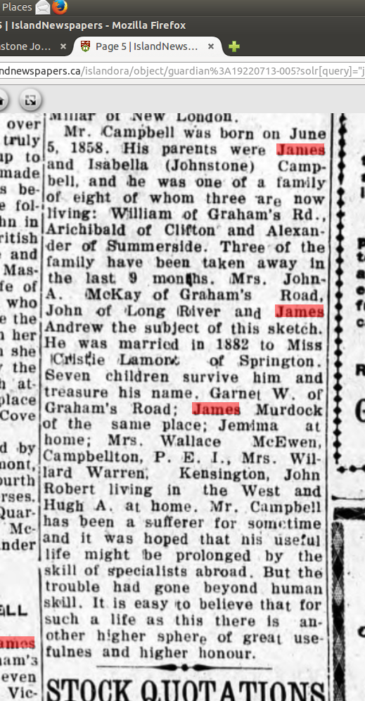 John R. and Hugh A.1901 census Lot 20 *see entry on James Andrew Campbell in Past & Present of PEI
