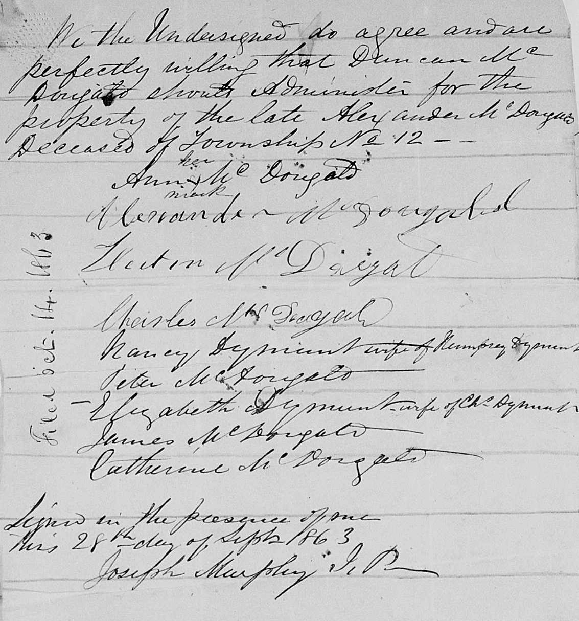 Hector's first wife was Elizabeth P. Hardy, daughter of Solomon Hardy of Lot 3. I was unable to find their marriage record - this information came from her obituary, gravestone and their childrens' marriage records. There seem to be incomplete records for his children from his first marriage. Elizabeth Hardy McDougald's obituary said they had 8 children at the time of her death, and this was repeated by Rev. Robert Dyer in his diary. The 1861 census also indicates that there are a couple of missing children.