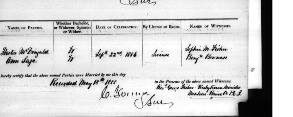 | Marriage | September 22, 1886 | Montrose, Lot 3, Prince County, Prince Edward Island, Canada | he was a widower, she was a widow. from PEI Marriages | |