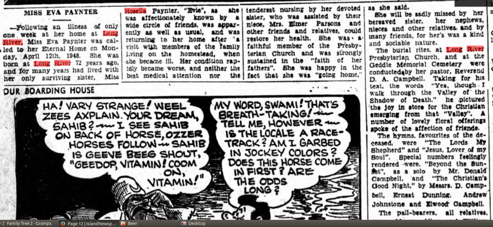 | Death | April 12, 1948 | Long River, Lot 20, Queens County, Prince Edward Island, Canada | no gravestone for Eva and her sister. | |