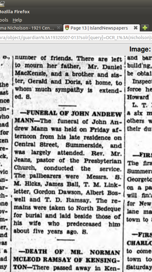 According to her obituary in a local Summerside paper, Eliza died in 1927 after a fall in her home. Two years later, John's widowed sister Bessie and niece Jean moved to Summerside to live with him. He died in 1932 at the age of 74. His death record gave his parents names as William Mann and Jennett Johnston.