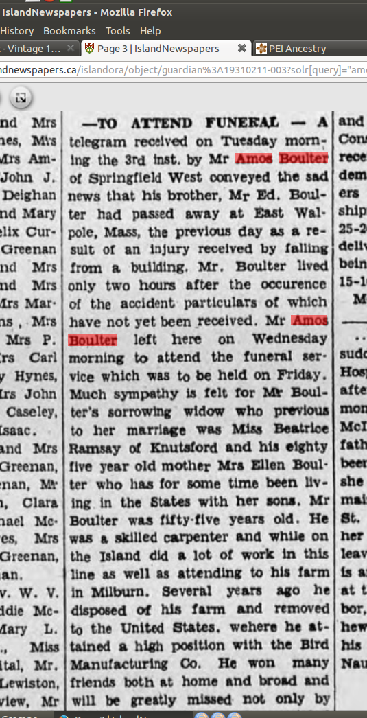 ā'IāO ATTEND FUNERAL -ā- A telegram received on Tuesday morn- ing the 3rd inst. by Mr Amos Boulter of Springfield West conveyed the sad news that his brother, Mr Ed. Boul- ter had passed away at East Wai- pole, Mass (Guardian 1931)