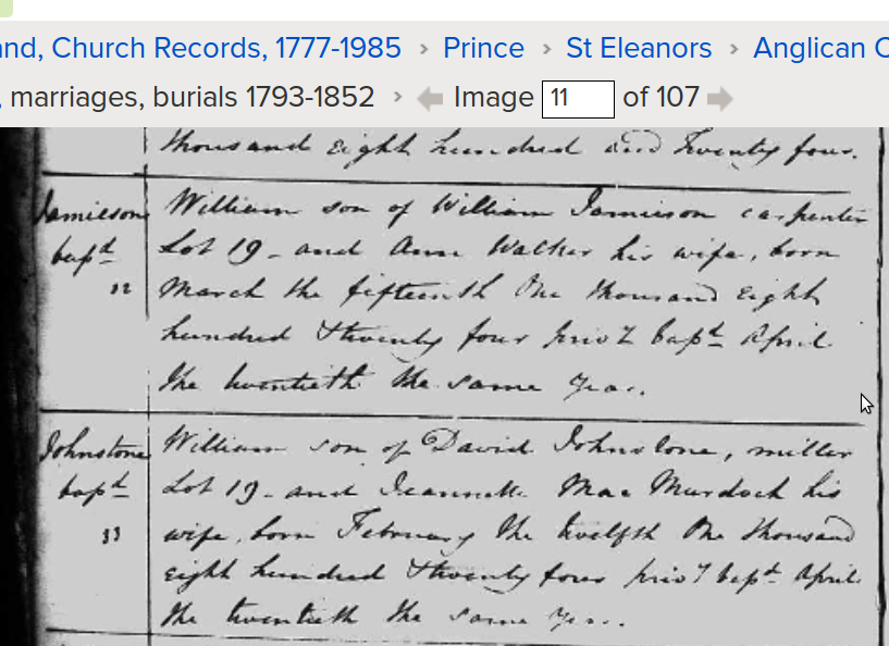 PEI Births database lists William Johnstone, born to David (miller) and his wife Jeanette MacMurdock, Lot 19, 12 Feb 1824.