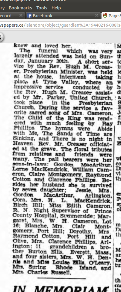| Death | January 27, 1944 | Port Hill, Lot 13, Prince County, Prince Edward Island, Canada | ||