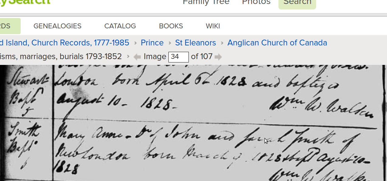 Mary Anne was baptized in New London, and married in the Church of England in Alberton. This follows the movements of John and Sarah Smith and the rest of their family, from New London to the Western Road, Lot 2. Some of the baptismal records for John and Sarah give her maiden name, Vincent.
