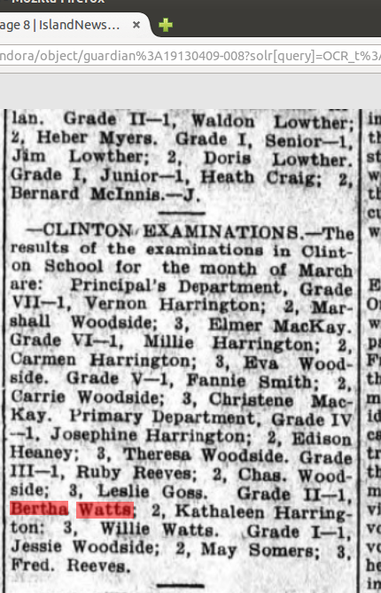 In 1923, the Charlottetown Guardian noted that "Mr. Leslie Mann. Burlington, spent Sunday in Clinton, the guest of Mr. John Watts". Les Mann and Bertha Watts were married in 1924, and had a family of 6.