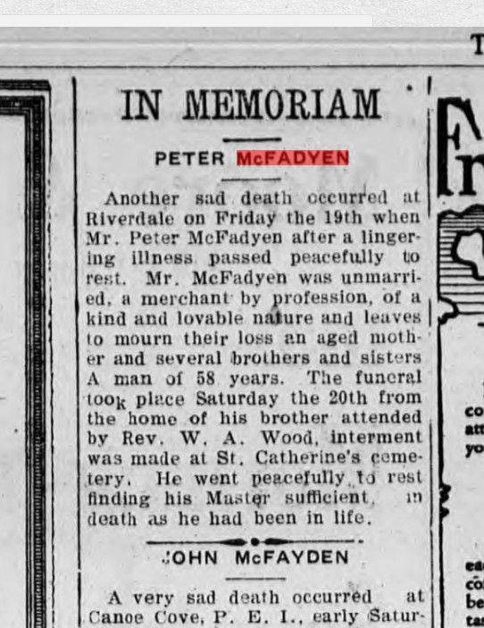 Peter, a merchant, never married. He died in 1920. He left a bequest to Flora Ann McFadyen.