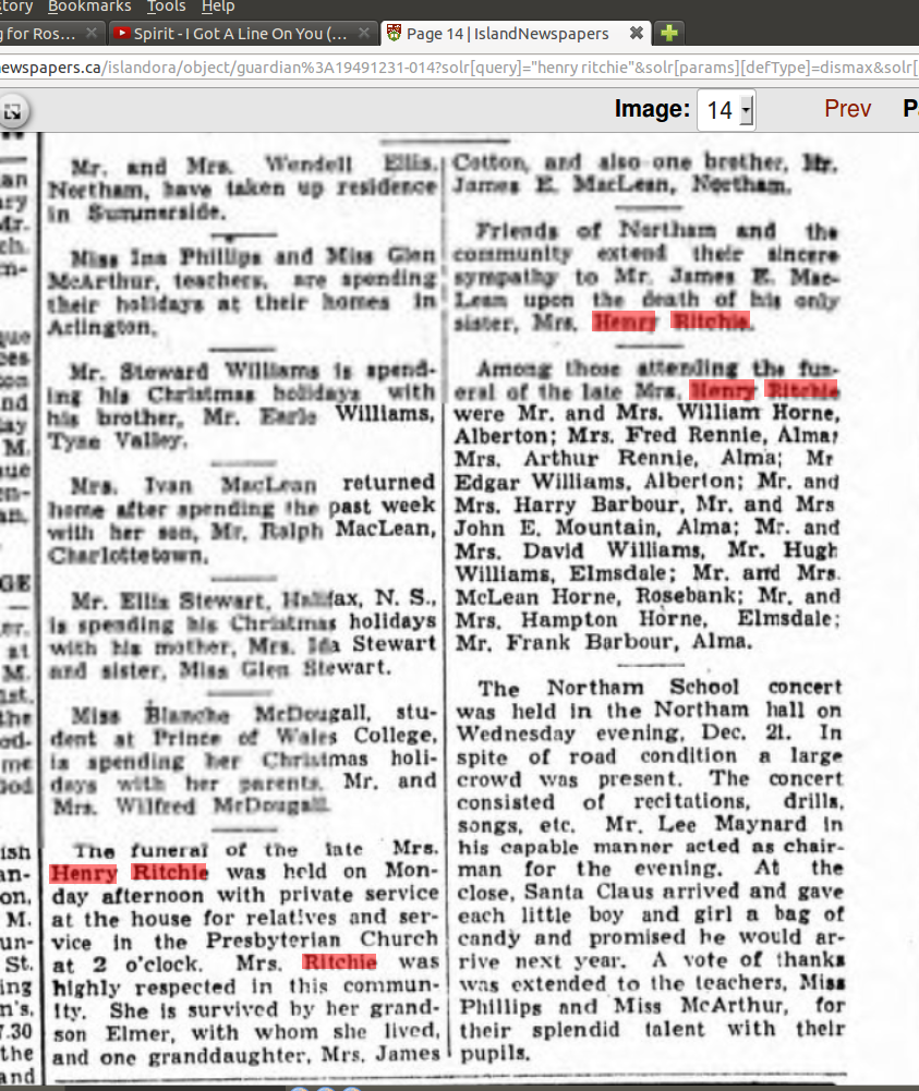 | Death | December 17, 1949 | Tyne Valley, Lot 13, Prince County, Prince Edward Island, Canada | dates from gravestone in Tyne Valley | |
