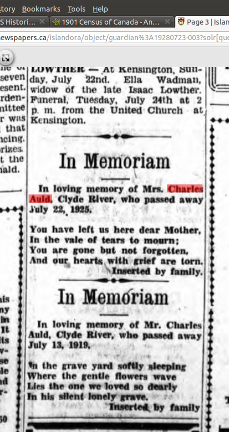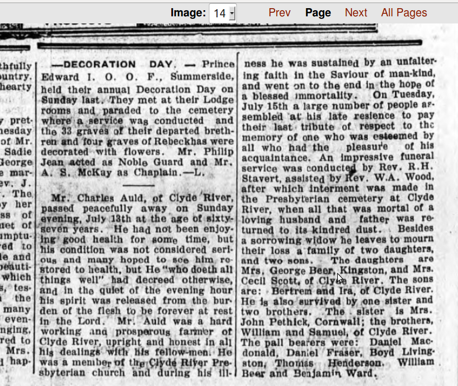 Death | July 13, 1919 | Lot 31, Queens County, Prince Edward Island, Canada | CMNI - Charles G. Auld, age 66 at Clyde River; church records | |